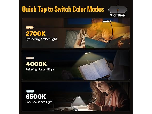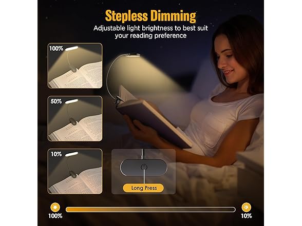 - 3 Color Modes & Brightness Control: The clip-on book light has 3 color modes—warm, neutral, and cool—making it perfect as reading lights for books in bed. Press once to change color, hold to adjust brightness from 100% to 10%. This book light clip on design keeps hands free, and as a reading book light, it clips firmly to books, tablets, or e-readers