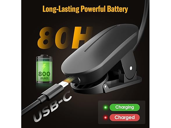 - Long-lasting Rechargeable Battery: The book light rechargeable runs 8–80 hours per charge, making it a dependable rechargeable reading light. Its quick 2-hour charge suits busy readers. This compact book lamp is easy to carry and bright enough for long reading sessions without frequent recharging