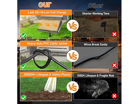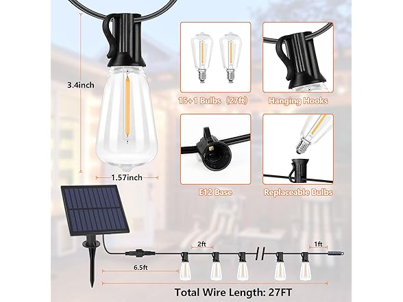 - 【Easy installation & Widely Used】Our solar powered string lights can be placed anywhere, either stuck into the ground or fixed to a wall. Designed with easy-to-install cup hooks on each bulb, these LED outdoor string lights are incredibly flexible and practical, making them perfect for a variety of spaces such as patios, backyards, decks, bistros, cafes, pergolas, gardens, markets, and more.