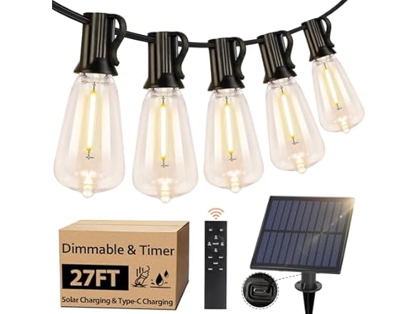 - 【Solar Powered &Type-C Charging】The outdoor solar string lights soak up the sun's energy during the day and automatically turn on at night, requiring no electricity. Besides, the extra Type-C charging ports guarantees a productive charging without worrying about continuous rainy days, providing a hassle free using experience. 180 degree adjustable solar panel allows you to change the direction accordingly to get the panel maximum exposed under sunlight to gain a better charging effect
