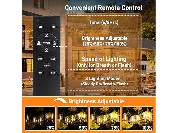 - 【Convenient Remote Control & Timer Function】These lights string are the perfect solution for bringing beautiful and functional lighting to your outdoor spaces. With the remote, you can easily turn the lights on and off, adjust the brightness levels, set the 6H/8H timer, or switch between different flashing modes. Using the remote is extremely convenient, no need to search for a switch or climb up and down to adjust the lights. Plus, no extra dimmer needed, saves both money and effort