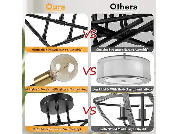 - 6-Light Brighter Design & Adjustable & No Dark Corner: This farmhouse ceiling light fixture comes with 6 light bulb sockets, combining with open design, which will provide much more illumination to your place than those products with less lights. Moreover, adopting angle adjustable design, it allows you to adjust the direction of the light as you need, and it will light up every corner of your space while you are reading, watching TV, playing games or having fun with family or friends and so on.