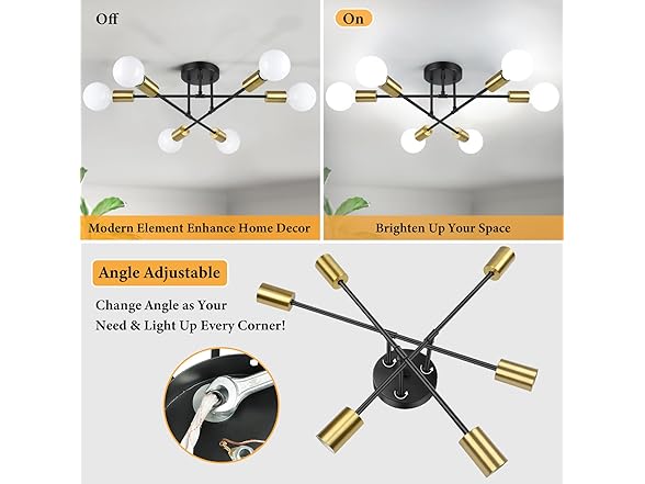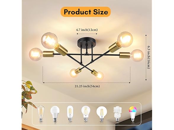 - Apply to All E26 Bulbs & Dimmable: This sputnik chandelier fixture comes with standard E26 sockets which is good for you to match any E26 base light bulbs with different shapes/colors to create desired atmospheres as you like. What’s more, if you would like to have dimmable lighting, smoothly fully dimmable will be available by matching dimmable bulbs/incandescent bulbs and dimmer switch with this ceiling light fixture. (Note: dimmer switch/bulbs not included)