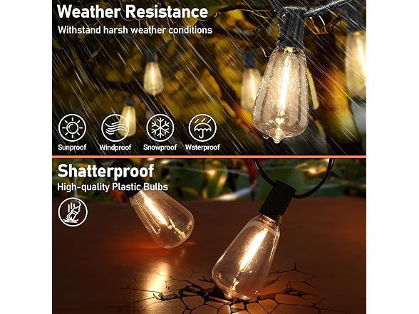 - 【Waterproof & Shatterproof】Our patio lights feature a completed sealed and waterproof design that can withstand even the harshest weather conditions, including sunny, rainy, windy or so on. Made of hard plastic, the led bulbs of this string lights are shatterproof and no-breaking even it falls on the ground, no dangerous shards, much safer for using. The premium materials made thicker cord will definitely withstand the wear and tear of years whether for outdoor or indoor use.