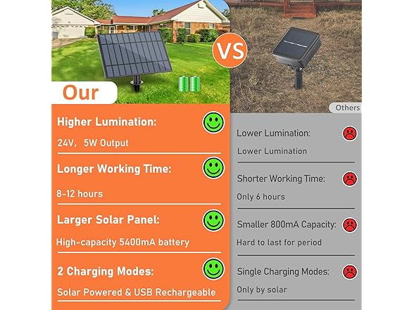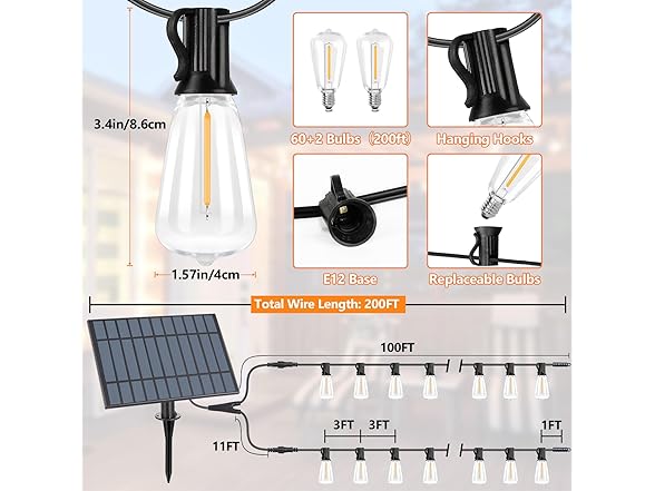 - 【Easy installation & Widely Used】Our solar powered string lights can be placed anywhere, either stuck into the ground or fixed to a wall. Designed with easy-to-install cup hooks on each bulb, these LED outdoor string lights are incredibly flexible and practical, making them perfect for a variety of spaces such as patios, backyards, decks, bistros, cafes, pergolas, gardens, markets, and more. Please feel free to reach us at any time if you have any problems or require assistance.