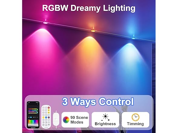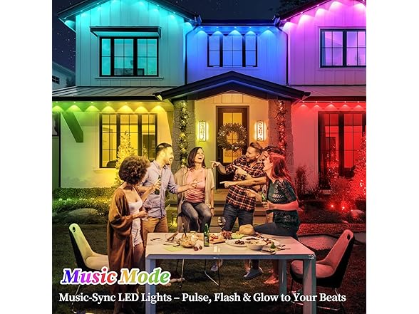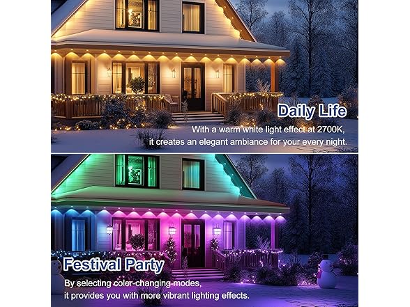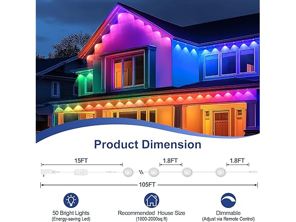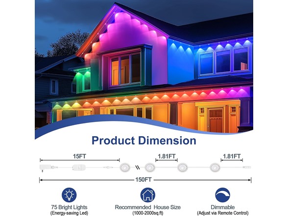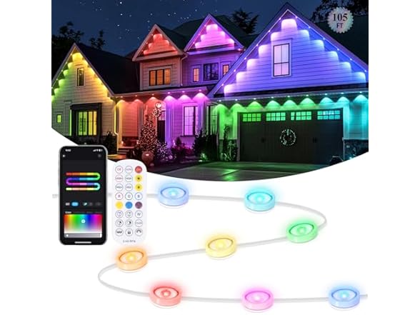 - Smart 105FT or 150FT RGBW Permanent Lights: App/Remote control, 90+ dynamic scenes, Music Sync, and DIY modes. Features clear lens for crisp triangular beams, 2700K–6500K color temperature, and 50 or 100 lm/light. Perfect for holidays, daily accent, and parties. Set timers, customize multi-colors, and enjoy effortless outdoor ambiance.