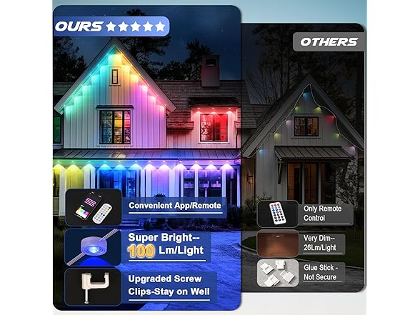 - Install Once, Enjoy Forever: Each Christmas outdoor light is equipped with pre-assembled high-strength adhesive tape and upgraded cable screw clips for secure installation(Warm reminder: you need to manually screw up the screws). The glued eave lights can easily support their weight and withstand pulling forces up to 15lb, eliminating the need for frequent adjustments. Bid farewell to the hassle of climbing the ladder repeatedly to re-attach lights and spend more time enjoying the ambiance.