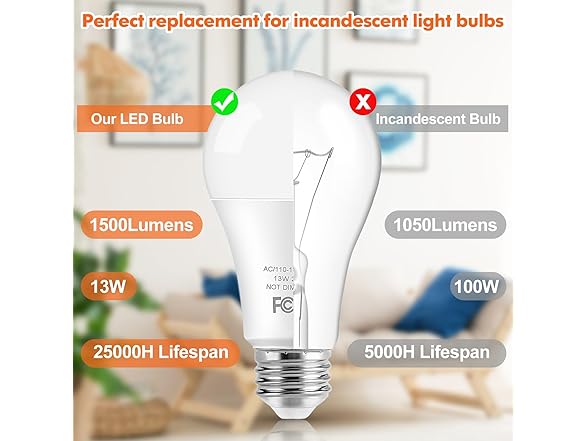 - Efficient and Cost-saving: This LED light bulb consumes only 13 watts of energy, which is equivalent to a 100-125 watt traditional incandescent bulb. While providing the same brightness, LED light bulbs' powerful heat dissipation and long lifespan of over 25,000 hours, and save you the annoyance of frequent bulb replacement.