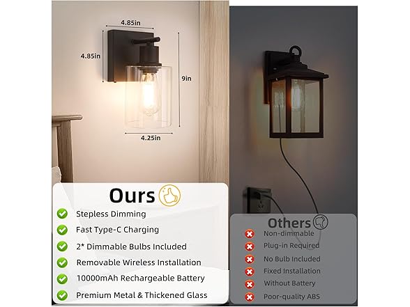- 10-100 % Stepless Dimming & Memory Function: Equipped with a sensitive touch button on the right side, this rechargeable wall sconce allows for effortlessly on/off with a gentle tap, and a long press can easily adjust the brightness from 10% to 100%, catering to your diverse lighting preferences. Furthermore, our wireless wall lantern boasts a highly practical memory function that retains the last set brightness level, ensuring the same lighting effect without the need for manual adjustment