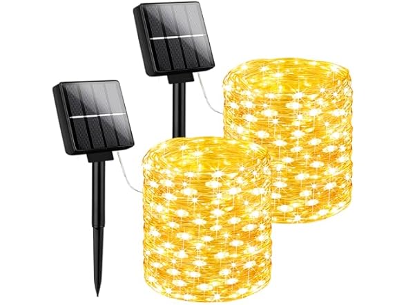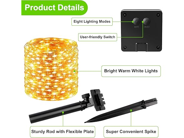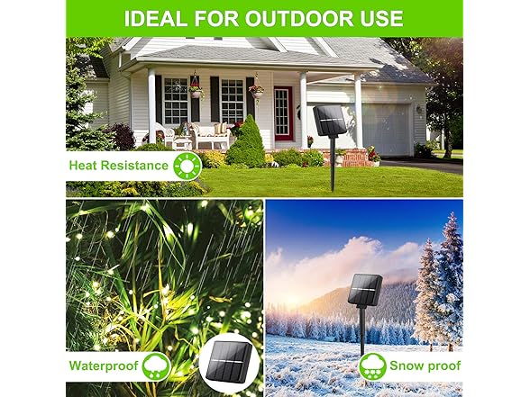 - 【Eight Romantic Lighting Modes】These solar string lights feature eight lighting modes, including steady on, combination, in waves, sequential, slow-glow, chasing, slow fade and twinkle. Different lighting settings produce different lighting atmosphere. So you could choose your preferred lighting mode to decorate your home in special festivals or brighten up the exterior of your home at night