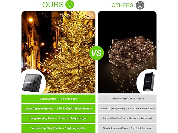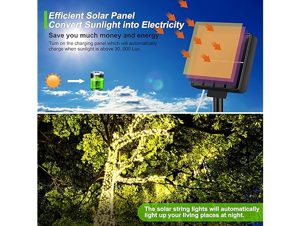 - 【Highly Efficient -powered Panel】Brightever LED string lights are equipped with durable panels which can convert sunlight directly into electricity. That is to say, these string lights use renewable energy, effectively saving the environment and dramatically reducing your electricity bills. You can use these string lights anywhere, any time. They can give off impressive lighting effects for 10 hours if fully charged at daytime