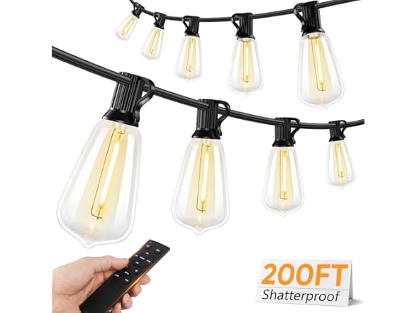 - 【Unrivaled Durability & Energy Efficiency】Crafted with upgraded heavy-duty wires and reinforced PVC coating, our 200FT string lights with remote are designed to withstand long-term wear and tear from both indoor and outdoor use. Utilizing innovative energy-saving filament tech and undergoing rigorous durability testing, these LED bulbs offer a lifespan of up to 30,000 hours while consuming 90% less energy than incandescent bulbs. Ideal for holiday decorations or daily lighting in any space.