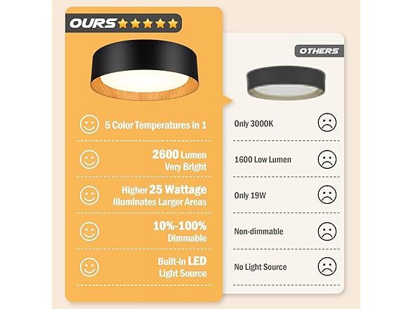 In the Box: (1) BrightHome Flush Mount Ceiling Light, 13in 2600LM 25W(300W Equiv), LED Ceiling Light Fixture 5CCT 2700K 3000K 4000K 5000K 6000K, Dimmable Ceiling Lamp, Black & Wood
