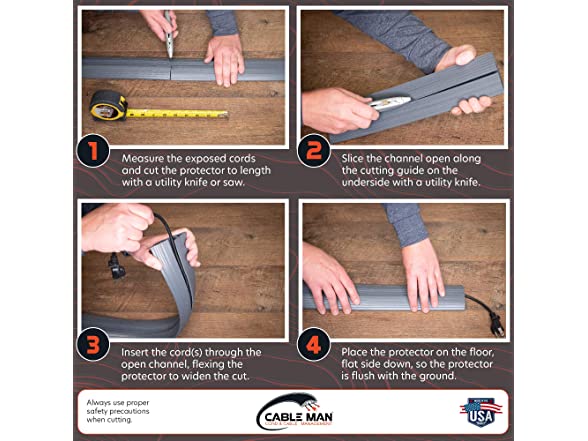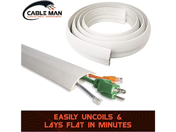- LAYS FLAT QUICKLY - The cable organizer is engineered to easily uncoil and lay flat in minutes with specially formulated recycled vinyl materials that offer premium durability. The cable cover will lay flush with the ground, no need for adhesive glues or tapes. Simply cut the channel guide, insert the wires, and lay in place