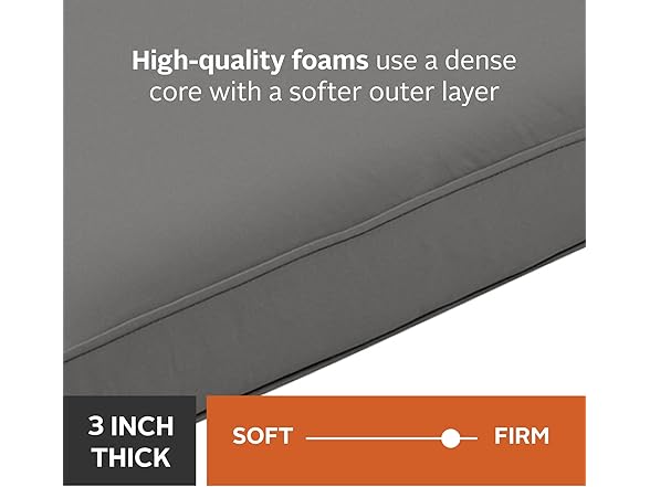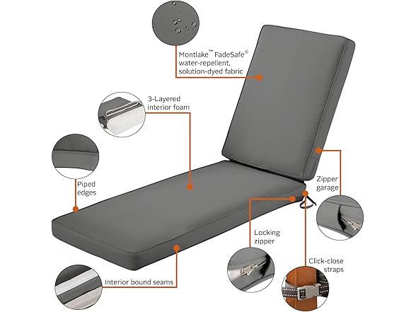 Classic Accessories' Montlake™ Cushion Collection is offered in 6 colors and 28 sizes and is made with FadeSafe™ solution-dyed fabric to ensure that colors last in all conditions. Montlake™ FadeSafe™ fabric uses a high-denier polyester to give you maximum comfort and lasting performance. High-quality foams use a dense core with a softer outer layer to provide just the right amount of give for a firm but comfortable surface. These cushions provide a fashion-forward look with durable materials to make your patio space appealing and inviting whenever you want to go outdoors. When you buy a Classic Accessories patio cushion you are not just getting a cushion; you're also purchasing lasting comfort and peace of mind. Not only will your patio cushions be protected from the elements, but you'll be protected with the easiest warranty in the industry. If your patio cushion fails within the warranty period, look for us online and take advantage of our Hassle-Free warranty program supported by our US-based customer service team.