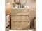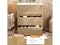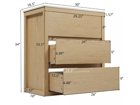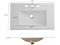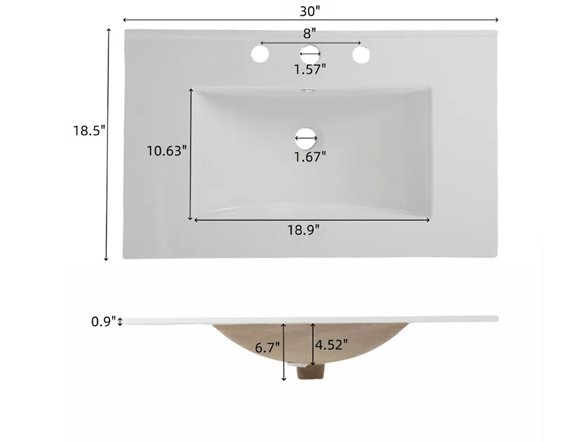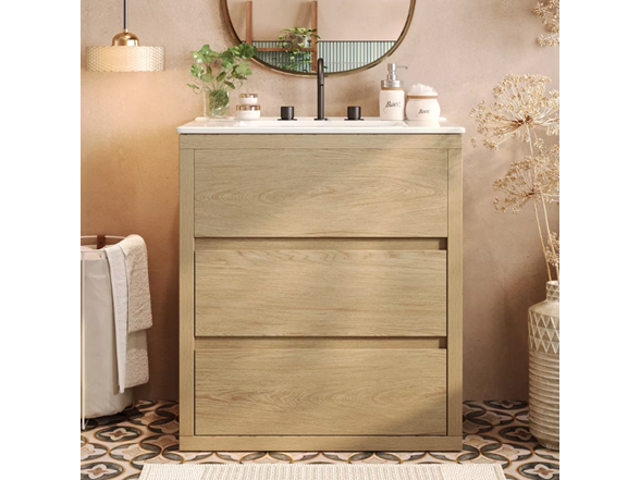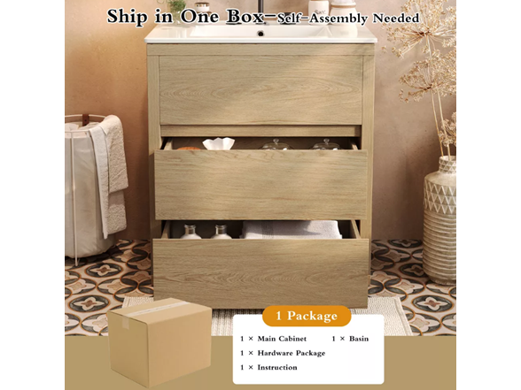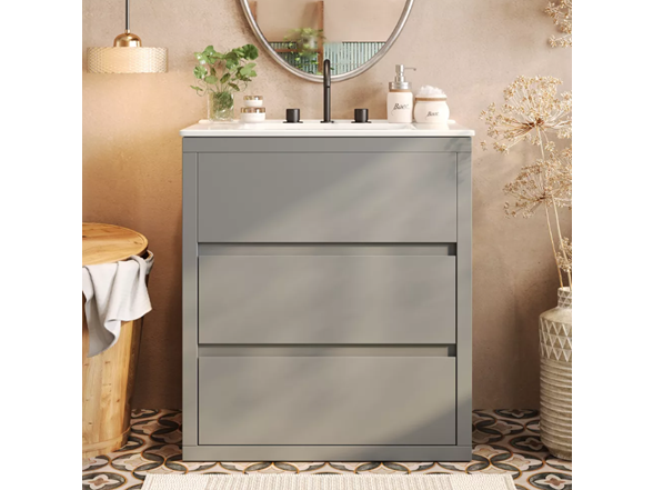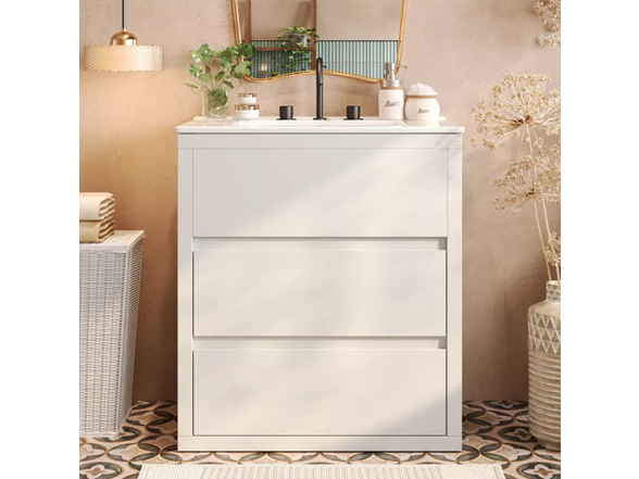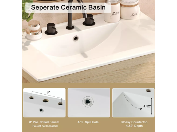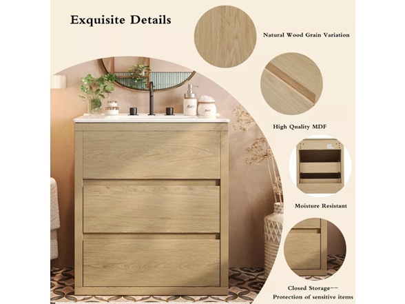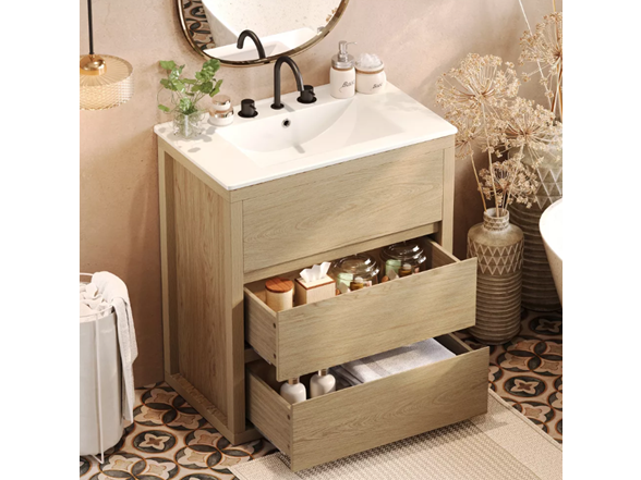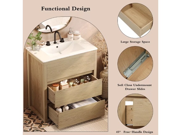 This bathroom vanity showcases a minimalist undermount design that discreetly hides hardware, creating a clean and modern look while maximizing drawer space for enhanced functionality. The integrated white ceramic sink features a deep basin and non-porous surface, offering excellent resistance to stains, scratches, and bacteria while remaining glossy and easy to clean. Designed for humid environments, the vanity provides ample enclosed storage with two full-extension drawers to keep toiletries organized. The innovative 45° beveled handleless drawer system ensures smooth, tool-free access while maintaining a seamless, elegant profile when closed.