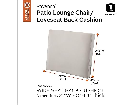 Add comfort to your outdoor furniture with the Ravenna Patio Cushion Collection by Classic Accessories. Made with a solution-dyed polyester, our Gardelle One Fabric System keeps Mother Nature and unforeseen spills at bay with resisting stains and helping keep rain out so your cushion foam stays protected. High-quality foams provide just the right amount of give for a firm but comfortable surface. We offer 6 rich colors designed to stand the test of time and fit a variety of tastes. When you buy a Classic Accessories patio cushion you are not just getting a cushion; you're also purchasing lasting comfort and peace of mind. Not only will your patio cushions be protected from the elements, but you'll be protected with the easiest warranty in the industry. If your patio cushion fails within the warranty period, look for us online and take advantage of our Hassle-Free warranty program supported by our US-based customer service team.