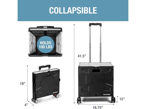 The CleverMade Collapsible Wheeled Crate with Integrated Lid, 4-Wheel Version is your ultimate companion for easy maneuverability and efficient storage. This utility cart on wheels is perfect for grocery runs, picnics, tool transport, office supply organization, and household chores. Designed for the movers and shakers - busy pros, parents, students, and anyone who needs flexibility - this foldable cart features an adjustable easy-grip handle and four double wheels that make navigating tight spaces a breeze. With four double wheels, weight distribution is even, reducing the risk of wheels getting stuck due to debris and ensuring smooth movement. When not in use, it folds down, making it easy to tuck away in your home or car. This folding cart with wheels looks sharp while offering functional storage. The integrated lid, supporting up to 200 lbs, doubles as a seat or extra storage space for those long waits or travel breaks.