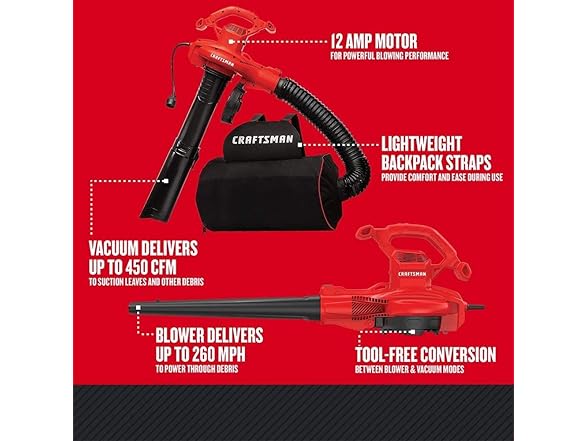 CRAFTSMAN CMEBL7000 3-in-1 Leaf Blower, Vacuum and Mulcher, Backpack Blower Up to 260 MPH, 12 Amp, Corded Electric Leaf Collector