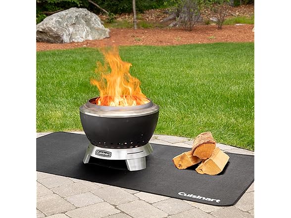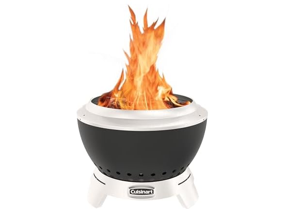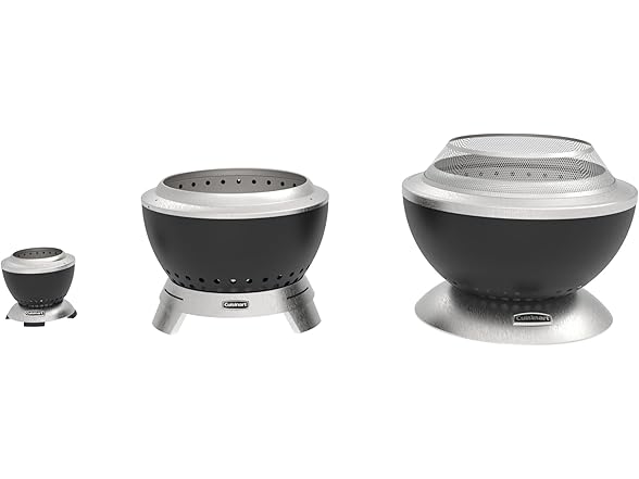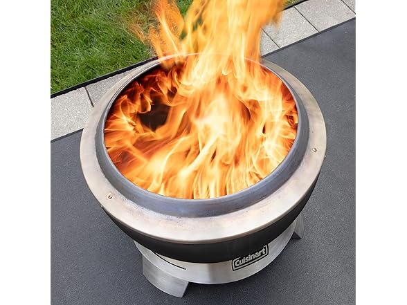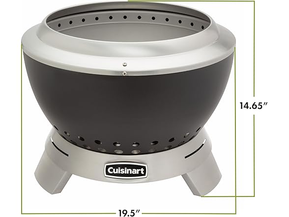 Stay Cozy, Stay Outdoors! Warmth without the smoke with the Cuisinart 19.5” Cleanburn Smokeless Fire Pit. With open wood fire pits, there is always someone who gets in the way of a cloud of smoke every so often, not anymore! Everyone can gather around and enjoy the warmth from this smokeless style fire pit! Fueled best by kiln dried / seasoned hardwood logs or wood chunks, this 19.5” Cleanburn smokeless design increases the airflow and burning process, so you can have the smokeless function with high heat performance. The bottom vents pull cooler oxygen in, feeding the flames from below while traveling between our innovative curved shaped double walls, causing the air to heat up, while igniting a fire faster. The hot air then travels through holes at the top of the unit, burning off any ash debris or smoke that the flames create, making this a smokeless fire pit. Clean up takes just 2 steps with our patent-pending removable tray for ash base design. Simply remove the cooled fire bowl and lift the base to empty the ashes. The Cleanburn is crafted with stainless-steel interior bowl, and high-heat black enameled steel outer bowl construction that will last for many great fires in the years to come. Weighing only 19.6 lbs. makes it easy to adjust its current location when cooled by lifting up the sides of the bowl when connected to the stainless-steel removable tray for ash base. the Cleanburn system makes you warmer, quicker! Experience the Cleanburn Advantage, Smokeless Flames, Limitless Memories!. Gather your friends around the Cuisinart 19.5" Cleanburn Smokeless Fire Pit and Ignite your Nights! . (Dimensions are: 19.5" Wide x 14.75” Height = Assembled.)