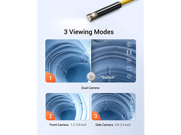 - [1080P Dual Lens With Split Screen Feature]: The dual-lens snake camera can inspect the range of 70° in front and its side with the ergonomics design. Allow you explore narrow areas without obstacles.The front camera focal range is 3-8cm / 1.2-3.1in and the side camera is 2-6cm / 0.8-2.4in. Easy to operate, the wireless hd inspection camera is ready to use after fully charged.