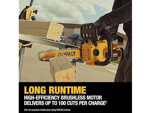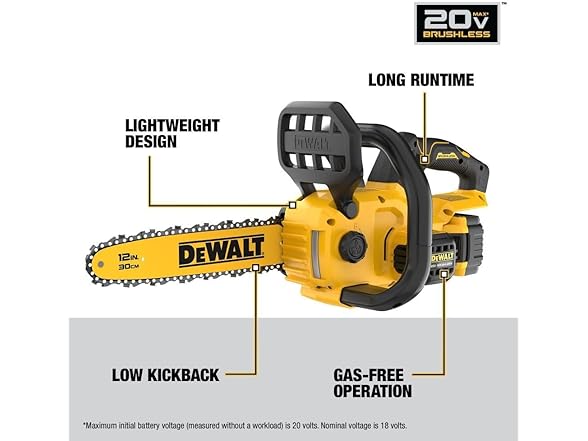 The 20V MAX* Compact 12 in. Brushless Cordless Chainsaw Kit delivers a gas-free operation that eliminates cold starts, fumes, carburetor issues, and helps minimize maintenance compared to gas-powered chainsaws. This battery-powered chainsaw delivers up to 100 cuts per charge and is designed for construction and outdoor jobs like cutting tree limbs and cutting beams. Lightweight design engineered to provide controlled cuts. This cordless, compact chainsaw features a high-efficiency brushless motor built to help maximize runtime. Powered by the included 20V MAX* battery, this chainsaw kit offers compact convenience and professional versatility.
