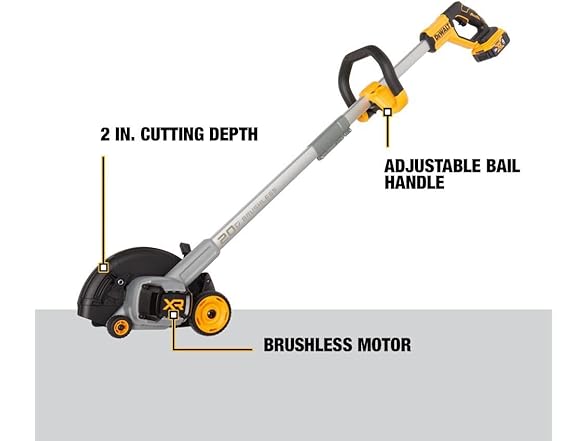 Get a professional-looking lawn by trimming and edging with this handy 20V MAX* Brushless Cordless Edger. This Edger was designed to help you create a clean lawn edge with an integrated edge guide for consistent, accurate cutting. Engineered for long blade life, the Edger offers up to 2 in. of cutting depth with 3-position depth adjustment. An efficient brushless motor and adjustable bail handle are equipped to help you maintain high productivity as you work.