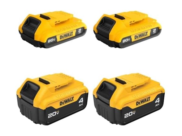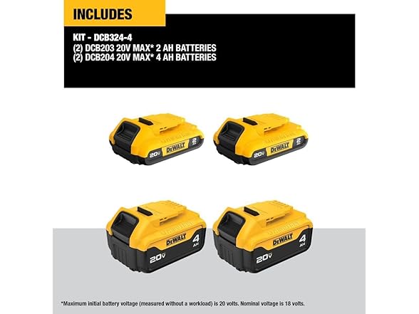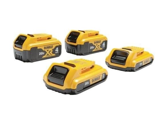 In the Box: (2) 20V MAX* XR 4Ah Lithium Ion Batteries; (2) 20V MAX* Compact 2Ah Lithium Ion Batteries