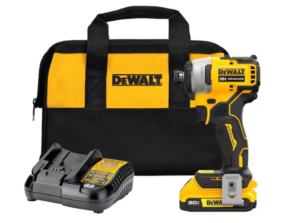 Complete jobs in compact spaces with the ATOMIC 20V MAX* Brushless 1/4 in. Compact Impact Driver. At only 5.1 in. long (front to back), this Impact Driver delivers up to 1,700 in-lbs. of torque. For user convenience, this kit includes a 20V MAX* 2Ah Battery. a charger, and a durable storage bag for portability on the jobsite.