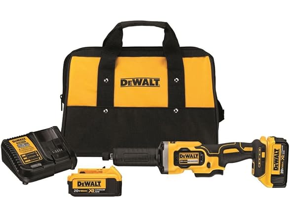 In the box: (1) DEWALT DCG426M2 20V Max Variable Speed Die Grinder Kit - (2) DCB204 4Ah Batteries, 1/4 in. Collet, DCB115 Charger, Die Grinder, Kitbag, Wrench