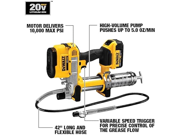 DEWALT DCGG571M1 Grease Gun Kit 20V MAX with Battery and Charger Cordless Grease Gun, 42” Hose, 10,000 PSI, Variable Speed Triggers