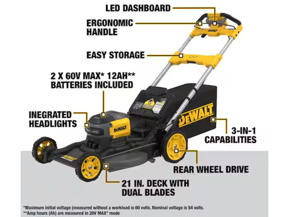 In the Box:- (1) Dewalt DCMWSP700Y2 DEWALT Self-Propelled Mower Kit - Dewalt DCMWSP700Y2 FLEXVOLT 2x60V MAX 21 in. Cordless Battery Powered Self Propelled Lawn Mower Kit with (2) 12.0 Ah Batteries and Charger