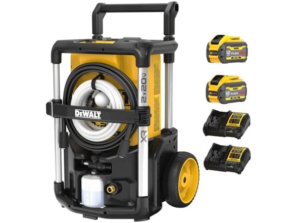 In the Box:- (1) DeWalt DCPW1600Y2 DW 20V MAX 1600 PSI 1.2 GPM Cold Water Cordless Pressure Washer Kit with (2) FLEXVOLT 12 Ah Batteries and (2) Chargers