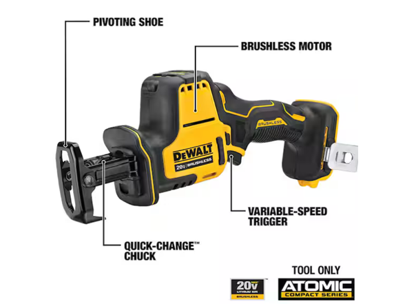 In the box: (1) DEWALT DCS369B ATOMIC 20V MAX Cordless Brushless Compact Reciprocating Saw Tool Only