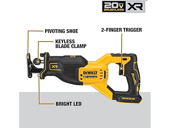In the Box:- (1) DEWALT DCS382B 20V MAX* Reciprocating Saw, Cordless, 2-Finger Variable Trigger, Keyless Blade Clamp, Tool Only