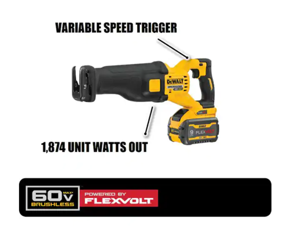 Our most powerful tools just got better with the 60-Volt MAX reciprocating saw. It provides up to 19% more power than the DCS388 60-Volt MAX reciprocating saw with 1874 unit watts out. With a no-load speed of 3000 SPM, this saw delivers the power of a corded reciprocating saw with the portability and convenience of a cordless through our revolutionary DEWALT FLEXVOLT technology.