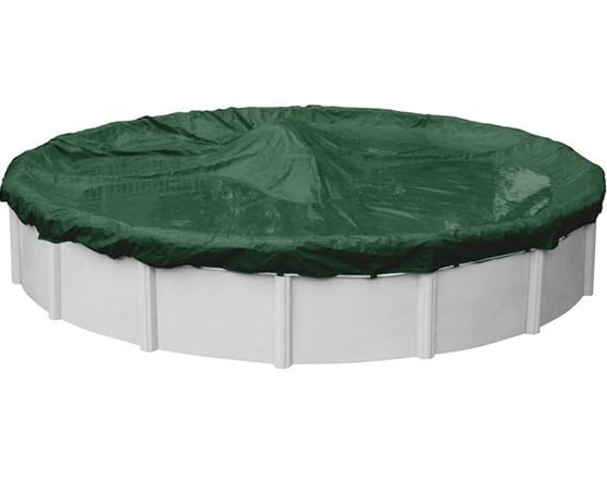 The Robelle Dura-Guard Winter Cover is a UV-resistant polyethylene solid winter cover for above ground pools. This cover includes a four-foot overlap, making this cover easier to secure to your pool than other pool covers. Please order by pool size, as the overlap goes beyond the pool size listed. If you have a very large top rail, please consider a larger pool size. The cover should be able to comfortably float on the pool water without excessive stress. The top of this cover is green, and the bottom side is black to prevent algae growth. The Robelle Dura-Guard Winter Cover features an 8 x 8 scrim. This cover is constructed with a polyethylene material that weighs 2.36 oz./yard2. Both the scrim count and material weight are good indicators of the strength of your pool cover. A cover with a high scrim count and heavy material will last longer than inferior covers. Two grommets are placed on center every four feet. With these grommets, you should use the included winch and all-weather cable to secure your pool cover. The Robelle Dura-Guard Winter Cover includes an eight-year warranty.