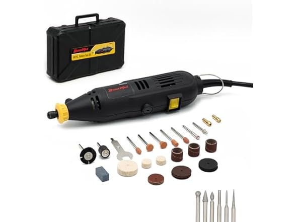 This comprehensive 40-piece rotary tool kit delivers versatile performance for all your grinding, cutting, sanding, and polishing projects. Featuring variable speed control from 8,000 to 30,000 RPM, this 120V tool adapts to different materials and applications with precision. The 1 Amp motor provides reliable power while the interchangeable collets accommodate 1/8 inch and 3/32 inch accessories. The extensive accessory collection includes 5 aluminum oxide grinding stones in various sizes, felt polishing wheels with mandrel, a radial bristle brush, sanding bands with drum sander, sanding discs, and 12 cut-off wheels for diverse cutting tasks. Also included is a bonus 6-piece diamond point set featuring ball, cylinder, cone, fusiform, and point tips with carbon steel bodies and diamond-coated surfaces for enhanced durability. The complete kit comes organized in a blow mold carrying case with color sleeve for easy storage and portability. Whether you're engraving, sharpening, cleaning, or detailing, this rotary tool kit provides everything needed for hobbyists and DIY enthusiasts to tackle a wide range of projects with professional results.