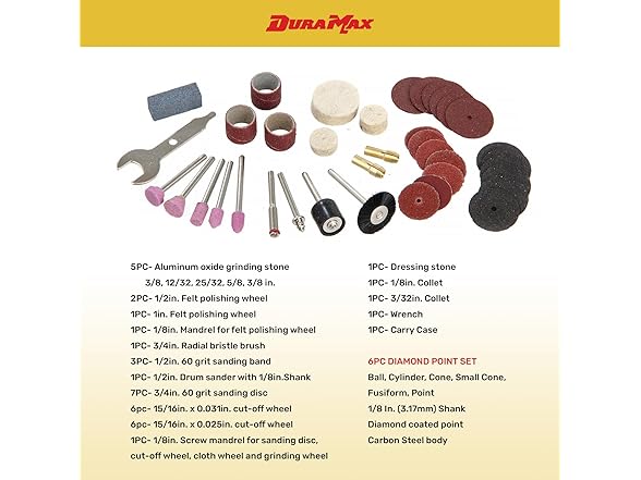 - COMPREHENSIVE 40-PIECE KIT: Includes 38 accessories plus tool - grinding stones, polishing wheels, sanding discs and bands, cut-off wheels, bristle brush, mandrels, collets, wrench, and dressing stone for versatile projects
