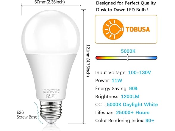 Auto On-Off, Dusk to Dawn Light Sensor Bulb, A19 Lamp Shape, 100 Watt Equivalent, 1200 lumen Super Bright, LED 11 Watt, Daylight White 5000K, No Flicker&Noise, 25000+hrs Lifespan, 1-YEAR Warranty |