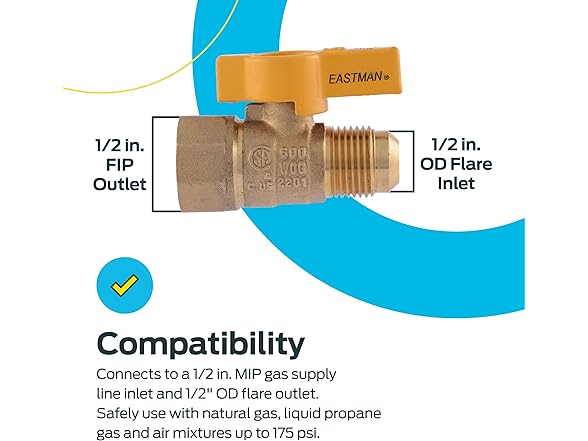 - SPECS: This brass ball valve connects to a 1/2 inch OD gas connector and a 1/2 inch FIP gas supply. Safely use with natural gas, liquid propane gas and air mixtures up to 175 PSI