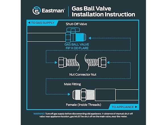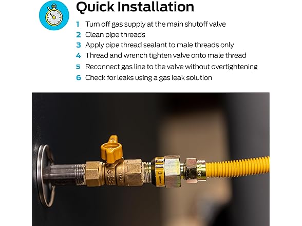 - EASY TO INSTALL: No special tools required to quickly connect gas connector to a gas supply. Simply clean pipe threads, apply sealant, thread steel fittings to manual shut-off valve and turn on the valve. Use gas leak test solution to ensure that it is leak free