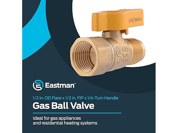 Elevate your home's gas control system with the Eastman Gas Ball Valve, a versatile solution for your diverse home improvement projects. Crafted with a robust brass body featuring double o-ring packing, this durable gas ball valve ensures lasting connections for applications ranging from grill setups and water heaters to fireplaces and furnaces. The aluminum lever handle, offering a quarter-turn operation, guarantees precise control over gas flow, enhancing the efficiency of your gas-powered appliances. Enjoy the flexibility of the in-line design, ideal for connecting two pipes going in the same direction. This gas ball valve effortlessly connects to a 1/2 inch OD gas connector and a 1/2 inch FIP gas supply, making it a reliable and convenient choice for upgrading your gas line setup.