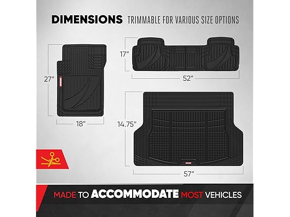 - TRIMMABLE AUTO FLOOR MATS & CARGO LINER: These floor mats for cars and SUV's with included trunk mat are designed to easily fit the contours of your vehicle's floor using just a pair of scissors. With a universal custom fit, they are perfect for most cars, SUVs, and minivans. Simply trim along the marked lines until you achieve a perfect fit. Front 27"L x 18"W / Rear 17"L x 52"W / Cargo Liner: 54"L x 37"W, making them versatile for a variety of vehicle types.