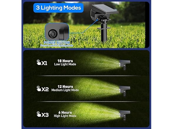 - 3 LIGHTING MODES: The outdoor solar lights for yard feature a light sensor system that automatically turns on at nightfall and off in the morning. There is one button to switch between the three lighting modes: Low light mode lasts 18 hours, Medium light mode lasts 12 hours, and High light mode lasts 6 hours.(Note:Whether solar spot lights outdoor can produce the best lighting effect is related to factors such as sunlight intensity, weather conditions, seasons etc
