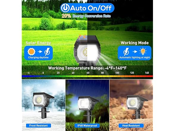 - IP68 WATERPROOF AND ANTIFOG DESIGN: The solar outdoor lights are made of high-strength and durable ABS material,Its operating temperature range is -4°F~140°F. IP68 waterproof design can provide normal lighting in severe conditions such as heavy snow, heavy rain, frost, etc.,It is perfect for outdoor use! The anti-fog design ensures better lighting effects and longer service life of the solar lights