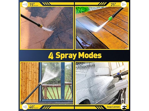 - [3 General Purpose Nozzles] High pressure is applied with the 0° nozzle to get rid of tough stains on hard surfaces . High pressure is available for hard surfaces like brick and concrete with the 15° nozzle . When applying medium pressure to softer surfaces like wood decks and railroad ties, the 25° nozzle works well . Low pressure is provided by the 40° nozzle for sensitive surfaces like screens and windows.