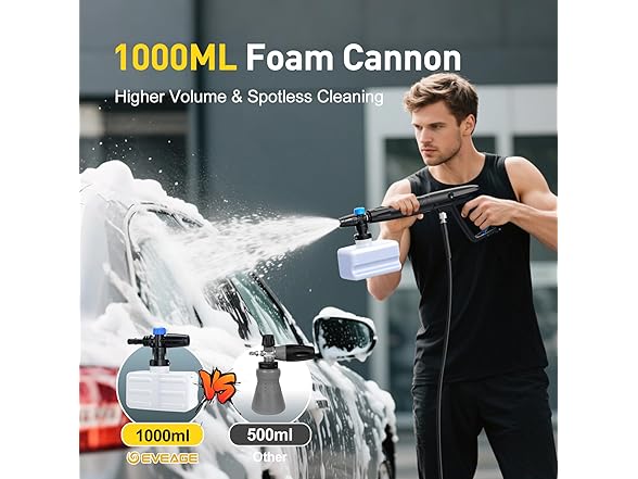 - [VERSATILITY] The versatility of this pressure washer is impressive . With the 1000ML foam cannon, many nozzles and attachments that come with it, one can customize the pressure and spray pattern to fit the needs of the cleaning job at hand . It manages everything with ease, whether cleaning the Car, fences, driveways, patios and home. NOTE: This product cannot be connected directly to a garden hose!!!!