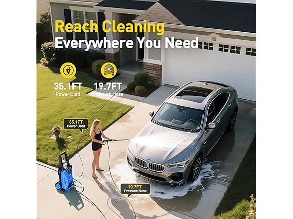 - [EASE TO USE]It's easy to use the power washer . Its easy-to-use controls and comprehensive instruction booklet make it suitable for anyone without prior pressure washer knowledge . The electric pressure washer is quickly and easily configured, and it is ready for use. Equipped with a 19.69 foot hose and a 35.1 foot power cord, providing sufficient contact range. For any inquiries, kindly get in touch with customer service.