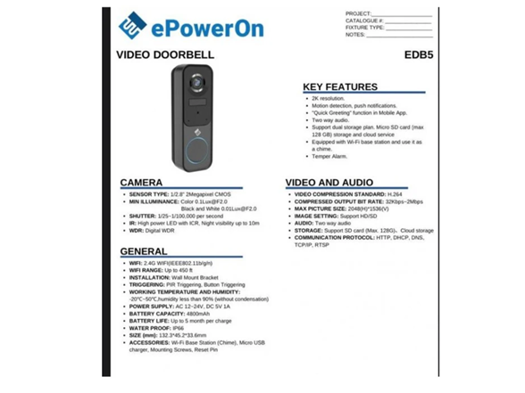 ePowerOn EDB5 Wireless Smart Video Doorbell Camera